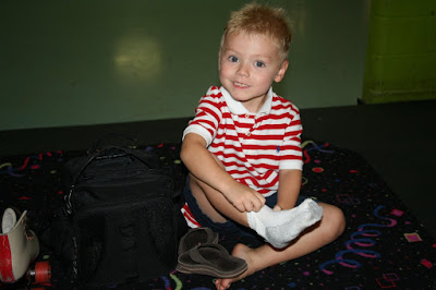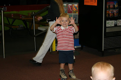 Thursday night was "Welcome back to School" at Skate Land in Mesa. That is all Cooper could talk about ever since he brought home the flyer. So we put it on the calendar and kept asking him if he was sure he wanted to go since he had never been there and had NO idea what it was or even how to skate? He was adamit about going so we did! First of all the place looks the exact same as it did 15-20 years ago (wow that just aged me) Secondly as soon as we got our skates on I almost fell over not knowing that 15 years and a lot of gravity later I was not so lite on my feet! Anyways Cooper got so excited when the skates were on that he tried right away to stand up and walk that he slipped and it was over... no more getting off the bench! I begged, I pleaded, I did what ever it was I could to get him on the rink in the middle to learn with me! NOPE! He must get that stubbornness from his dad... So the rest of the night I spent walking behind his little foot steps at snail speed just walking around as he pointed out kids in his class to me. He says he had a good time and wanted to know we did not bring our skates home with us?