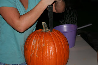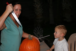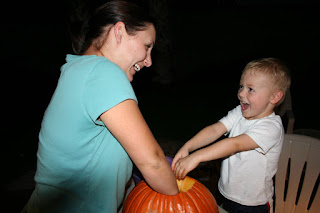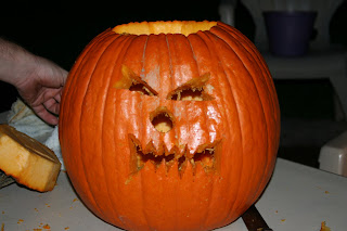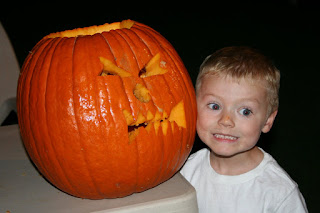 Well tonight we carved our Pumpkin we picked up at the farm Saturday night! Oh yes I need to post those pics too... Anyways, Cooper picked this one and he did a fine job at that! He wanted a "GREAT BIG ONE" I'm pretty sure I look a little devilish...